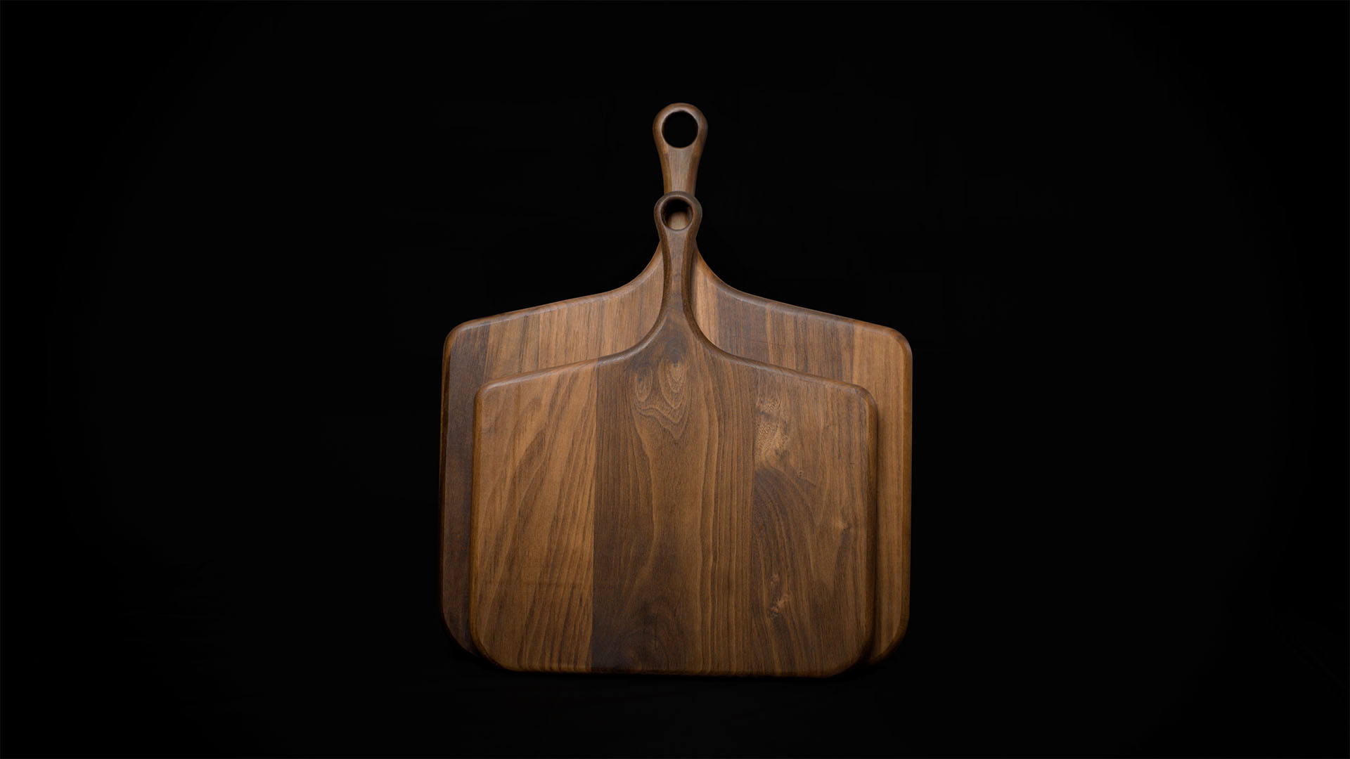 A beautifully matched pair of handcrafted American black walnut hardwood paddle boards, including the Regular Heritage™ Paddle Board and Large Heritage™ Paddle Board, made for charcuterie spreads, stylish serving, and versatile kitchen use.